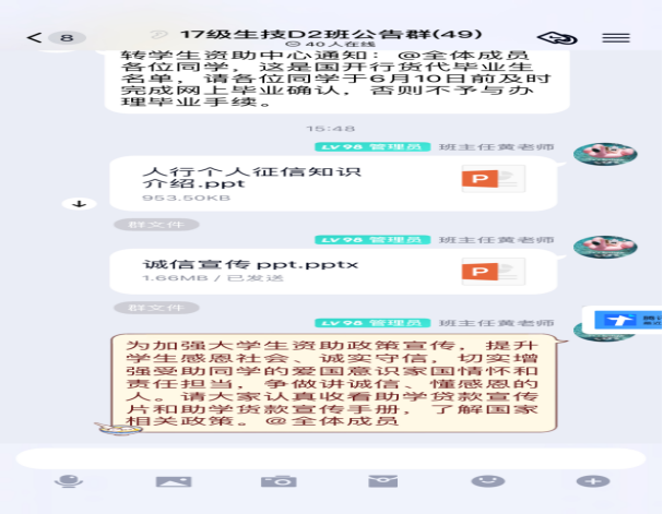 2.观看影片及发放宣传手册。将助学贷款宣传片、宣传手册ppt线上发放给学生,让学生更加熟悉贷款流程。通过《人行个人征信知识介绍》、《2020年诚信宣传》PPT等宣讲材料,向学生宣讲诚信和金融知识,普及征信及信用知识,以案例的形式向学生解读诚信感恩的重要性,进一步增强学生诚信意识。