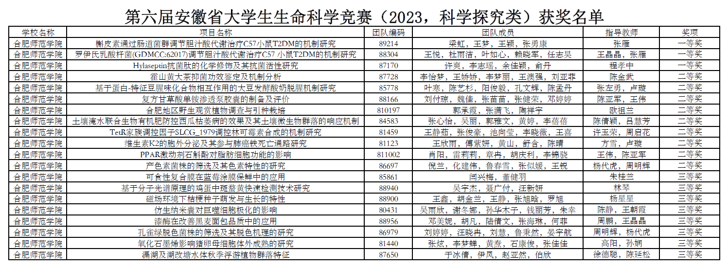 本网讯2023年7月29日-31日,由安徽省教育厅主办,安徽师范大学承办的第八届全国大学生生命科学竞赛(科学探究类)安徽赛区暨第六届安徽省大学生生命科学竞赛决赛在安徽师范大学成功举办。经过初赛网评和复赛现场答辩,我校学子再创佳绩,共有21项作品获奖,其中一等奖3项(1项入围全国决赛),二等奖9项,三等奖8项,再创赛事奖项新高,合肥师范学院荣获优秀组织奖。