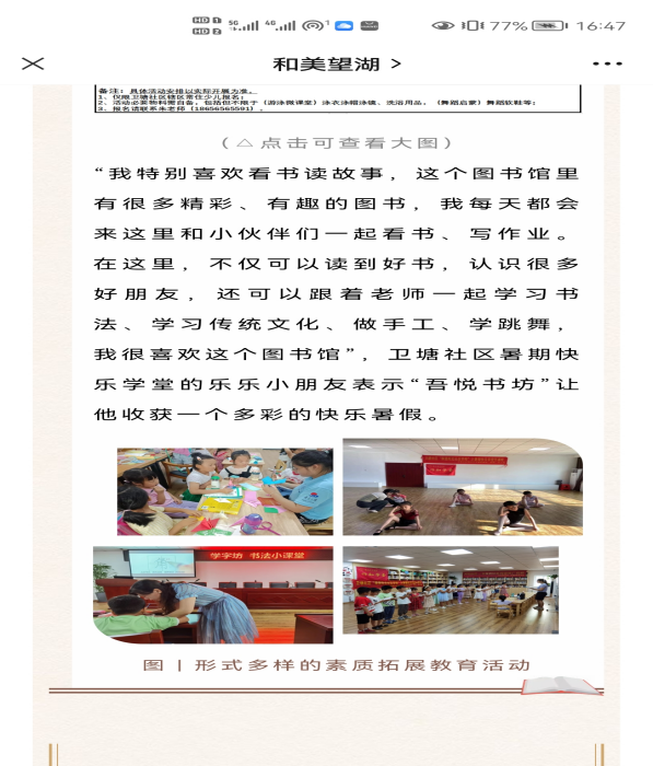 《学习强国》、《人民网》、《中国青年网》等国家级媒体相继报道学堂的开设情况,《安徽日报》、《掌中安徽》、《合肥晚报》等媒体报道了学堂日常生活情况。“喜迎二十大”爱国教育和暑期防溺水主题教育经合肥电视台进行采访,并于《晚间播报》、《早安合肥》等新闻频道、腾讯视频平台进行播放。此外,微信公众平台《美望湖》、《合师生科》也对学堂进行了宣传报道,该学堂共被各家媒体报道14次。