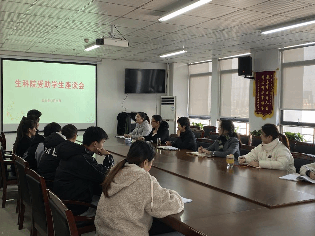 本网讯 临近新春,时至隆冬,为了能让家庭经济特别困难学生安心学习、认真备考、温暖过冬,2021年12月21日下午,生命科学学院于行知楼1502会议室召开受助学生座谈会。生命科学学院党委书记郭桃芬、副书记杨娜、学院全体辅导员和7名特困生参加了会议。会议由杨娜主持。