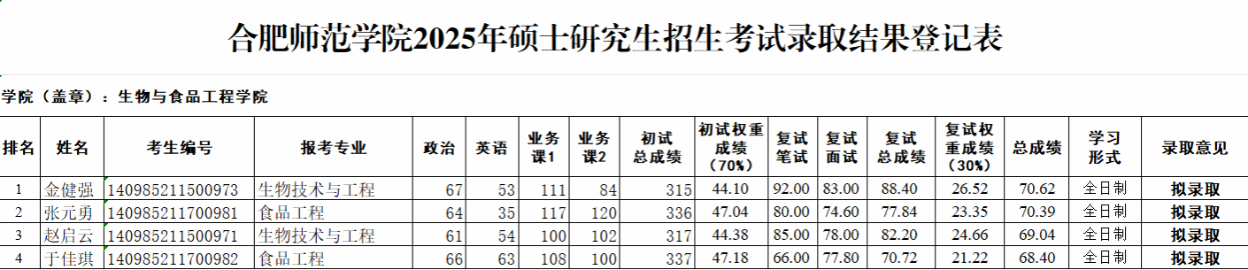 根据《合肥师范学院2025年硕士研究生招生复试录取工作方案》,生物与医药专业硕士研究生第一志愿拟录取名单公示如下: