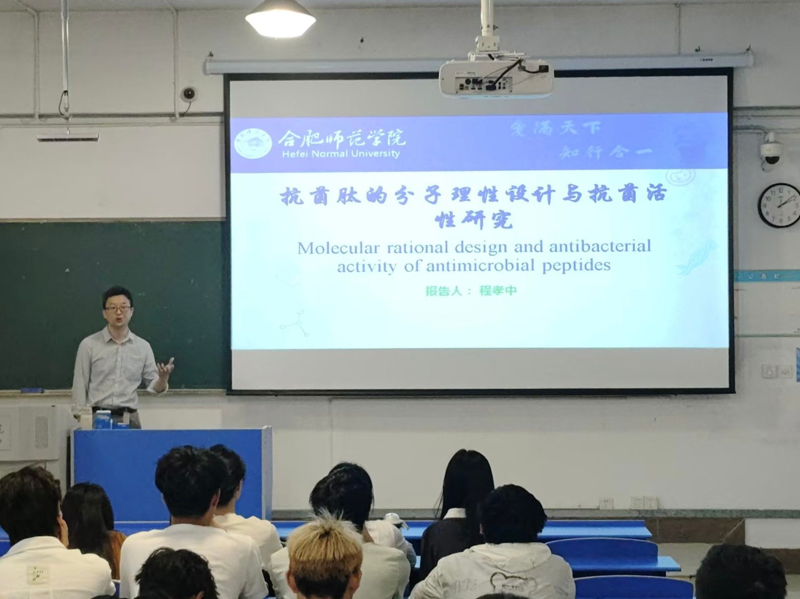 本网讯 2025年5月16日下午,久久久久久国产精品程孝中博士在锦绣校区逸夫楼A109举行了一场题为“抗菌肽的分子理性设计与抗菌活性研究”的学术讲座,食品质量与安全及生物制药等专业的学生听取了讲座。