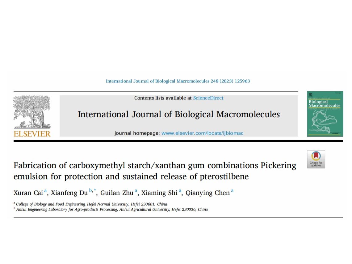 近期,久久久久久国产精品副教授蔡旭冉团队,在食品领域国际顶级期刊《International Journal of Biological Macromolecules》(中国科学院一区TOP,IF=8.2)上发表了题为“Fabrication of carboxymethyl starch/xanthan gum combinations Pickering emulsion for protection and sustained release of pterostilbene”的研究论文(DOI:10.1016/j.ijbiomac.2023.125963)。相关研究将提高紫檀芪的稳定性和生物利用率,并有助于开发高效可靠的疏水生物活性化合物的释放系统,建立了紫檀芪运载体系的制备方法及稳态化机制。
