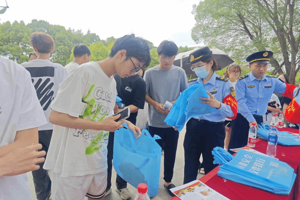 工作人员在逸夫楼广场前进行文明乘车、安全出行宣传。提醒学生拒绝乘坐非法运营车辆,增强交通安全防范意识。