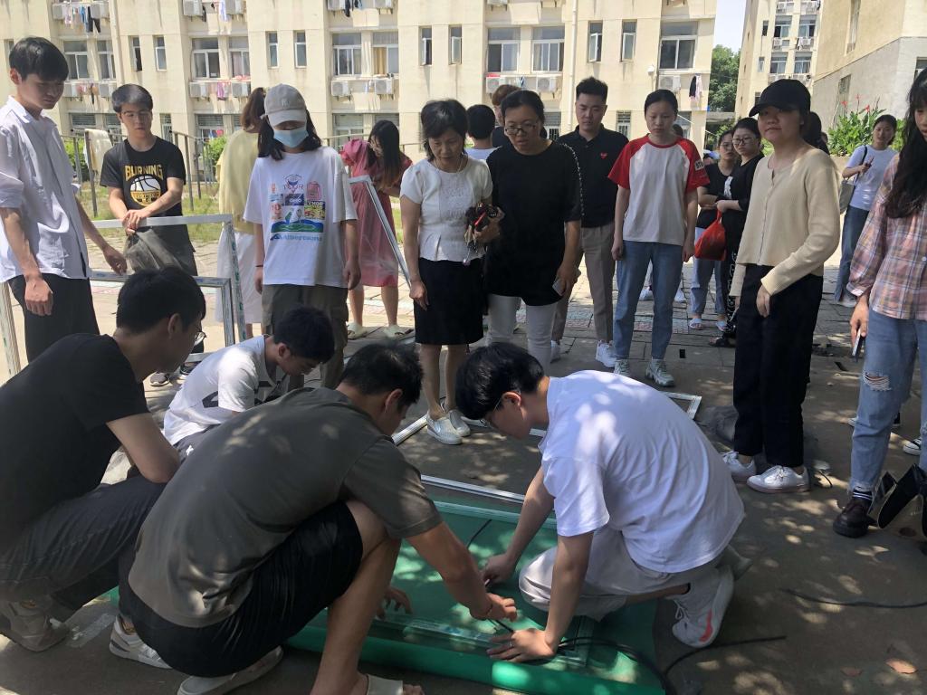 各寝室将破损的纱窗取下带到宿舍楼下排队,等待更换。学生党员有序分工,按之前统计的表格核对登记,拆卸旧窗纱、剪裁新窗纱、压条、整理。这些党员对更换窗纱并不熟悉,边干边摸索,满头大汗、手指划破,依然任劳任怨,成功完成生科院学生宿舍破损窗纱的更换工作。