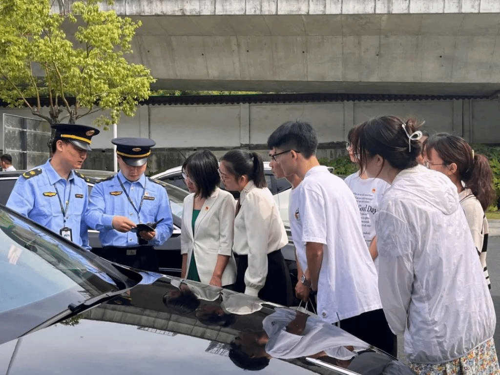 在高铁南站出租车通道,执法人员现场演示对出租车日常执法检查工作,介绍了出租车经营行为监管的内容;在网约车上客点,执法人员结合网约车运营资质检查工作,详细介绍了支队对网络预约出租汽车的监管职责,并向师生们进行普法宣传,提醒师生们出行时要选择合法合规的营运车辆乘坐。