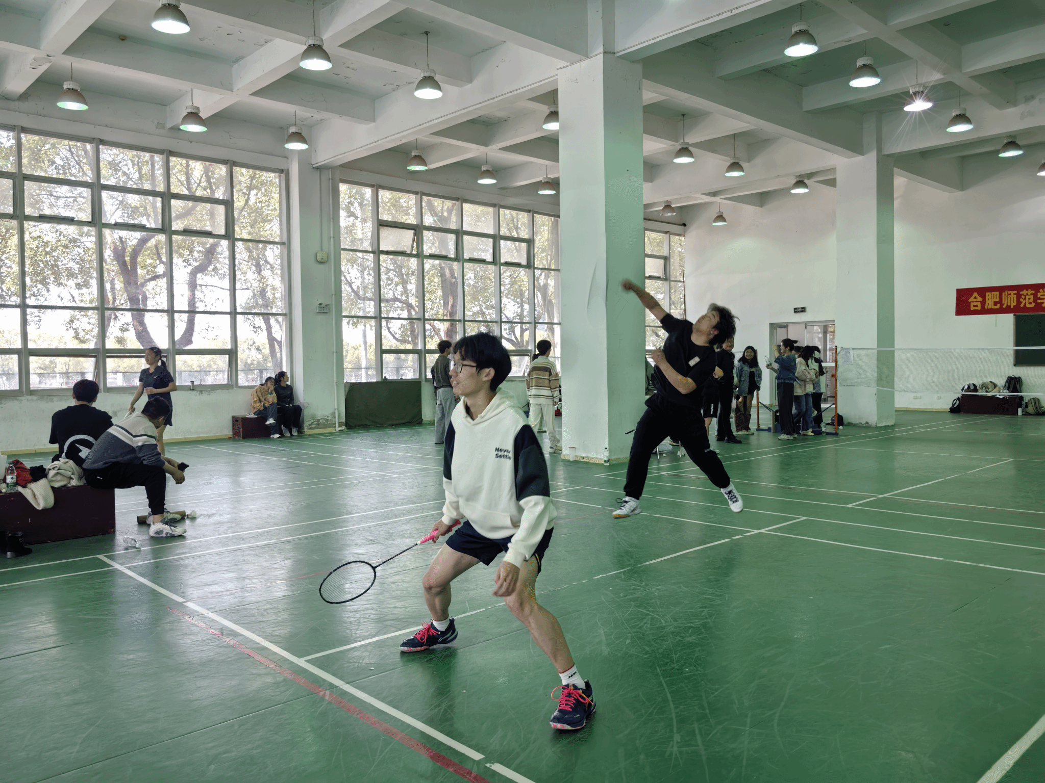 比赛设置了小组循环赛和淘汰赛,分师生组、学生男子组、学生女子组、学生男女混合组分组进行,师生组每队由一名教职工和一名学生组成。赛场上,选手们精神饱满,斗志昂扬,纷纷拿出自己的看家本领。凌厉的扣杀、巧妙的吊球、精准的接球,每一个精彩瞬间都赢得了观众们的阵阵喝彩。选手们在球场上挥洒着汗水,尽情展现着高超的球技和顽强拼搏的体育精神。