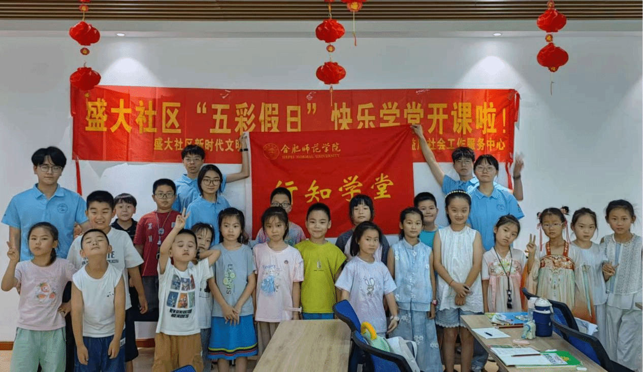 7月1日上午,久久久久久国产精品“盛大行知学堂”在合肥市望湖街道盛大社区银杏尚郡党群服务站三楼正式开班。本次活动由合肥师范学院久久久久久国产精品、盛大社区妇联、银杏尚郡党群服务站和益欣社工站联合举办,共吸引辖区35名小学员报名参加。
