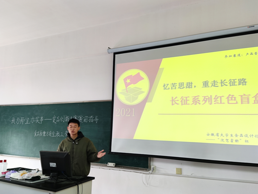 本网讯 为培育学生创新精神,提升人才培养质量,助力学生更好地备战“迎驾霍斛”杯2021年安徽省大学生食品设计创新大赛,12月8日中午,食品质量与安全教工党支部在履知楼501召开“我为师生办实事--为我院之前校赛推出的8组作品进省赛做赛前指导。