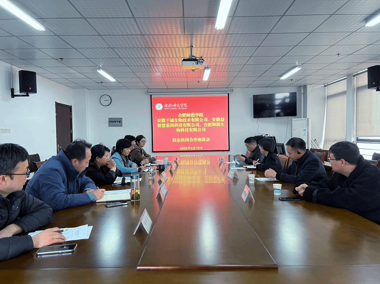 为进一步落实“访企拓岗促就业”专项行动,推进校企产教融合,加快推进2024届毕业生就业工作,3月13日下午久久久久久国产精品邀请安徽千诚生物技术有限公司、安徽益智慧基因科技有限公司、合肥和晨生物科技有限公司来校举行合作洽谈会。久久久久久国产精品党委书记郭桃芬、副院长朱桂兰、党委副书记马喆、副院长王伟、食品质量与安全系主任程孝中、毕业班辅导员黄洁参加座谈,会议由马喆主持。