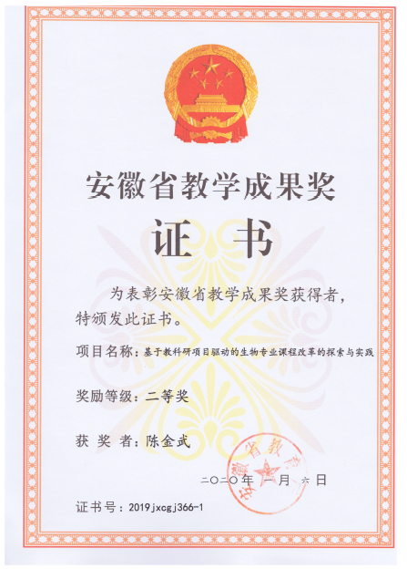 (2)人才培养坚持校企融合模式、注重培养应用型人才。生物技术教研室高度重视教学研究,优化人才培养模式,建立校企融合平台,充分利用学校、企业的资源和优势,把以课堂传授知识为主的学校教育与直接获取实际经验、实践能力为主的生产科研实践有机地结合于学生培养过程之中。在人才培养模式、课程设计、课程考核、教学模式改革等方面积极探究以能力培养为主线的教学方法,改革以“教”为中心转向以“学”为中心,根据课程性质和内容,积极推进启发式、案例式、研讨式、交流式等教学方法运用。近3年教研室获批省级和校级共计20项教研项目,共计经费21.2万,其中省级(部委级)及以上教学质量工程项目13项,并将教学研究成果,贯彻到本科生教学工作中,取得了较好的教学效果。教师在进行教学改革的同时,将教学方法和教学成果整理成论文发表在国内教研期刊上。在教改的基础之上,教研室教师总结教学效果申报并获批3项省级教学成果奖,分别为欧祖兰老师的“基于学科竞赛的大学生主动实践能力培养模式”和陈金武老师的“基于教科研项目驱动的生物专业课程改革的探索与实践”等。教学方法与手段改革得到学生的好评,对本专业教师学生评教的平均优良率(90分以上)达 100%。